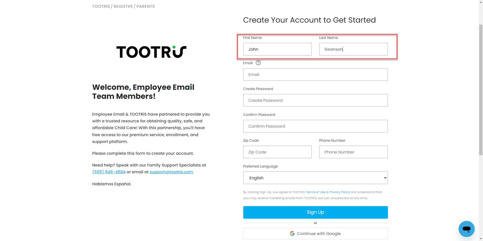 Para comenzar, puede hacer clic en el enlace en su correo electrónico de bienvenida que se envió o en la URL de la página de registro proporcionada por su organización. Una vez que lo haga, se le dirigirá a la página de registro de su organización.
